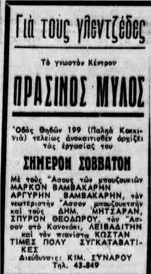 Απόκομμα εφημερίδας του 1948, που αναφέρει ότι ο Μάρκος Βαμβακάρης ήταν στη σκηνή του «Πράσινου Μύλου» στη λεωφόρο Θηβών στην Αθήνα.