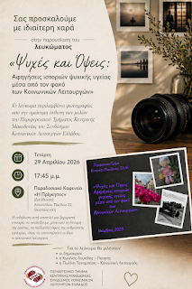 με ιδιαίτερη χαρά, σας προσκαλεί, στην παρουσίαση του φωτογραφικού λευκώματος με τίτλο «Ψυχές και Όψεις: Αφηγήσεις ιστοριών ψυχικής υγείας μέσα από τον φακό των Κοινωνικών Λειτουργών».Το λεύκωμα περιλαμβάνει φωτογραφίες από την ομώνυμη έκθεση των μελών του Περιφερειακού Τμήματος Κεντρικής Μακεδονίας του Συνδέσμου Κοινωνικών Λειτουργών Ελλάδος.